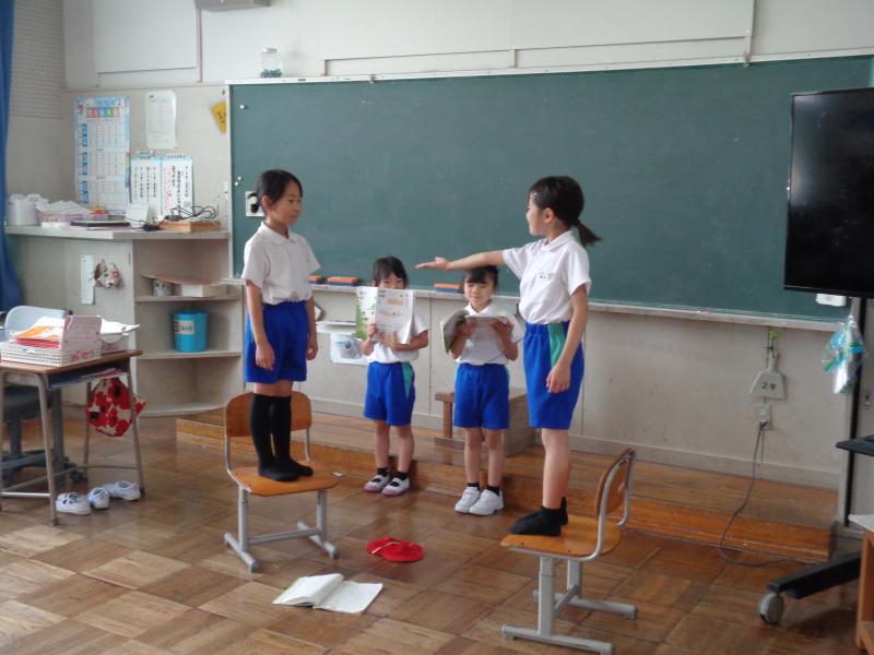 2年生は、長休みに国語科で学習した物語の音読を、いろいろな場所に分かれて、全校に紹介しました。登場人物の心情を考えて声の大きさや速さ等を変え、振り付けも入れるなどとっても上手に音読していました。