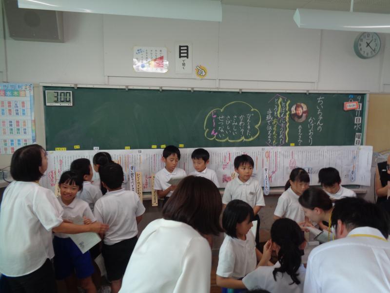 (写真)は友達と交流して学ぶ2年生と、3年生が6年生に国語科の物語で心をうたれた文章(場面)を紹介しているところです。