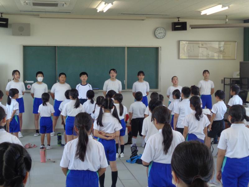 今日から運動会の応援練習が本格的に始まりました。朝、赤団、白団それぞれの場所に分かれて、6年生のリーダーを中心に応援練習に取り組みました。