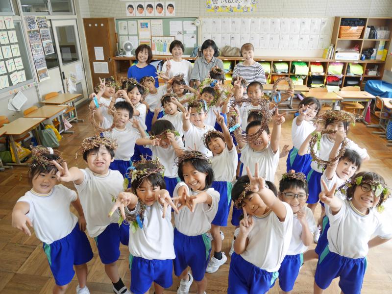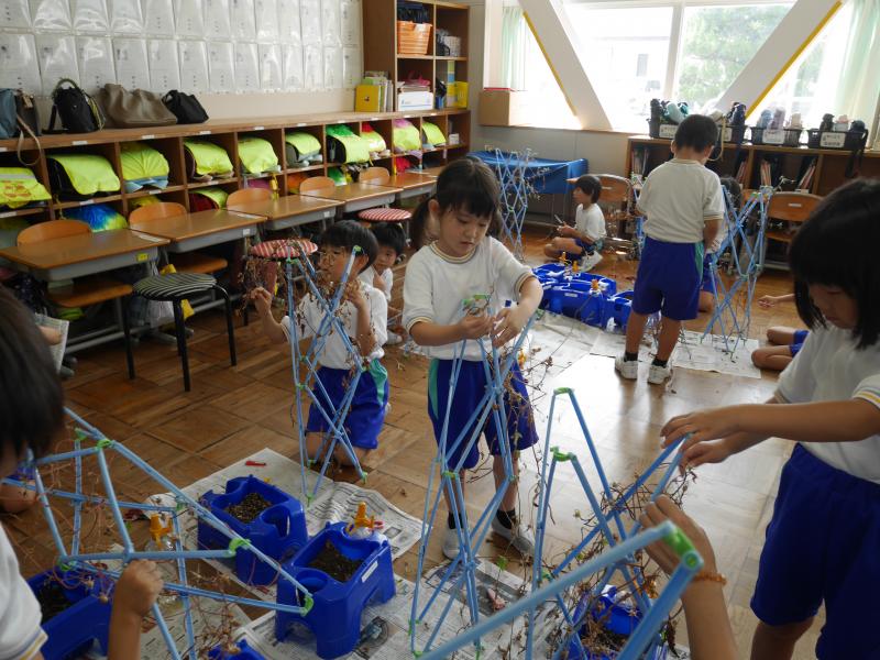 1年生は、これまで大切に育ててきた朝顔のつるを使って、リースづくりに取り組みました。つるを支柱から外すのに悪戦苦闘しながらも、お手伝いいただいた地域の方に助けられ、無事にかわいいリースを作ることができました。ありがとうございました。