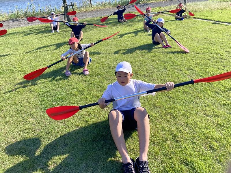 まずはパドルの使い方を教えていただき、芝生の上で練習しました。風が強くても自分で進むためには練習あるのみ!真剣な表情で練習していました。