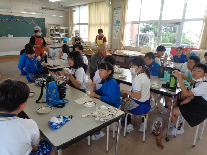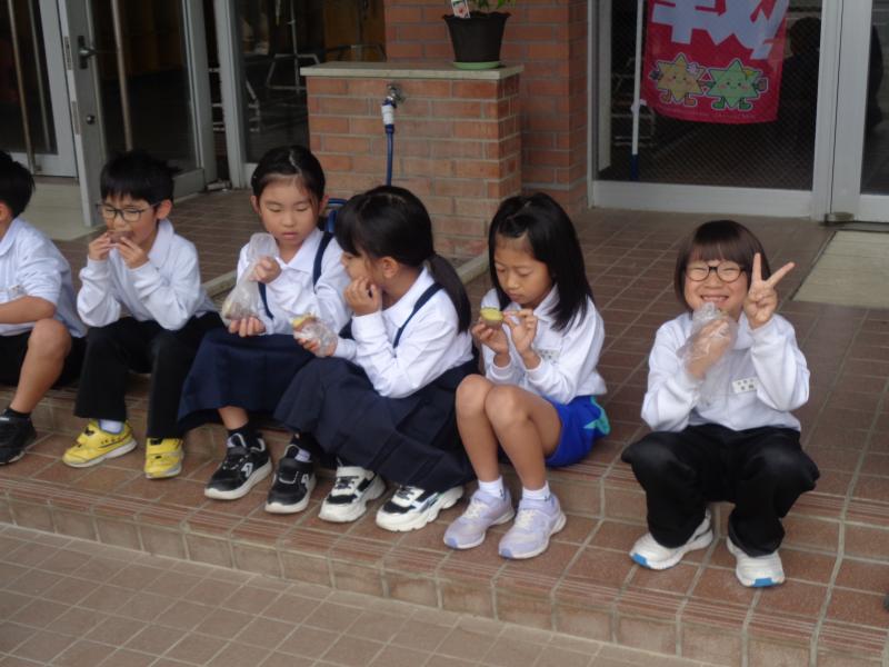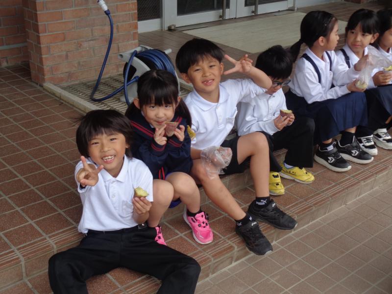 1年生が先日収穫したさつまいもを、高橋さんに焼き芋にしていただきました。裏谷さんにお手伝いいただいて育て、高橋さんに調理していただき、とっても甘くておいしい焼き芋を食べることができ、1年生は大喜びでした。
