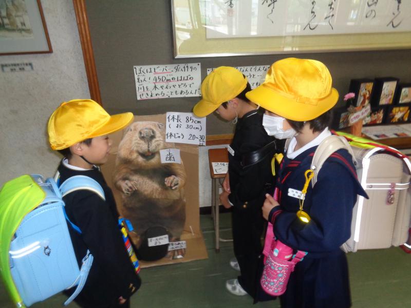 2年生が国語科でビーバーに関連した教材で学習してます。そこで今日は玄関前にビーバーの等身大の写真を掲示しました。想像していたより大きなビーバーに登校してきた児童は興味津々でした。