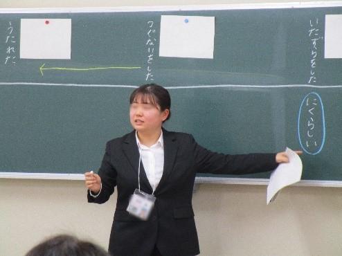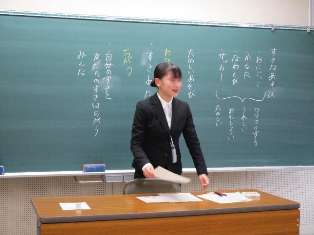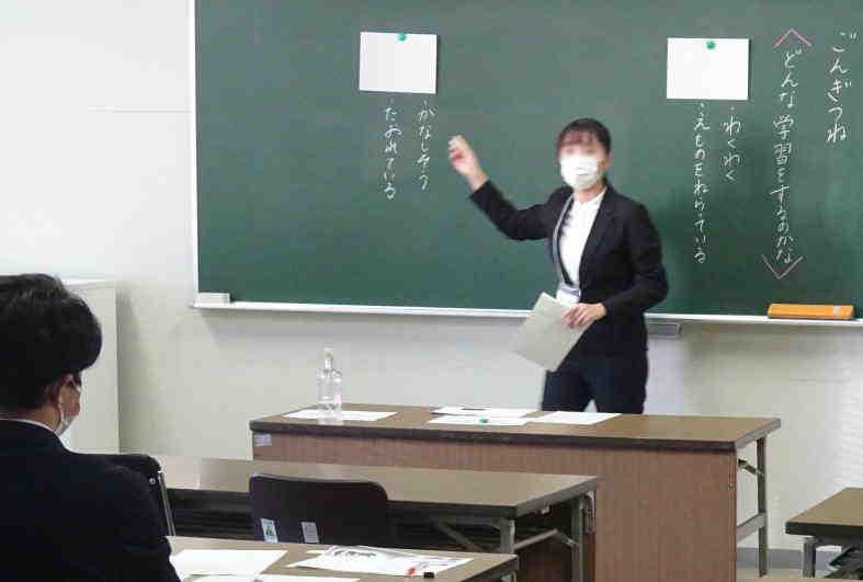受講生は、示範授業の先生のやわらかで受容的な姿を参考に、表情豊かに楽しそうに国語の模擬授業をしていました。縦書きの板書に苦労しながらも、国語のキーワードの「言語活動を通して」を意識し、児童が考えを伝え合う場面を工夫しながらつくっていました。 〔受講生の感想〕 はじめて国語の模擬授業をしてみて、算数とは違う進め方や話し方、動きなどが新鮮で楽しかった。国語は毎日ある教科なので、もっと力をつけていきたい。 |