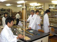 理科では、「新学習指導要領に対応した授業づくり」の講義の後、実習を行いました。実習1では、新内容の「水圧」を取り上げ、アクリル性の透明円筒とゴム膜を用いた実験器具を製作しました。実習2では、「身の回りの物質とその性質」としてプラスチックを取り上げ、実践に向けて様々な実験を体験しました。おみやげは、手作りプラスチック消しゴムです。