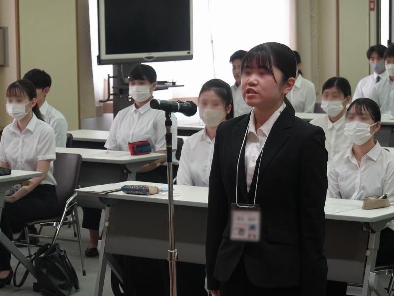 コロナ禍で大変な時期が長く続いたが、そのような状況の中でも多くの学びの機会をつくっていただいた。教職を志す、すばらしい仲間とともに切磋琢磨しながらこの日を迎えることができ感謝している。模擬授業では、自分では気づかなかった視点や価値を学び、「引き出し」を増やすことができた。この師範塾で積み上げてきた経験を生かし、石川の未来を拓く心豊かな子どもたちを育て上げられるように全力を尽くしたい。」(小学校グループ代表)」