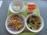 今日の給食はピー肉丼でした。ピーマンや玉ねぎ、とうもろこしなど