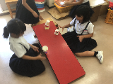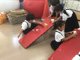 1年生が保育園や幼稚園の年長さんを迎えました。お店屋さんで買い物をして楽しませ、学校での生活や道具などを優しく丁寧に教えていました。