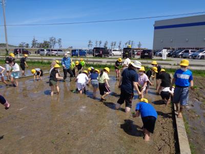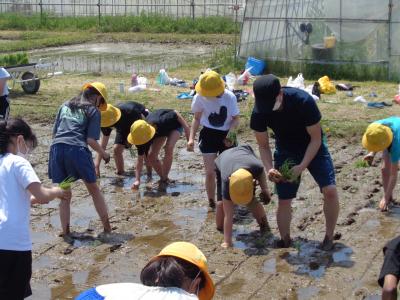 5年生 田の草取り 「食について考える」学習で、コメ作り体験をしています。5月の田植えに続いて、6月は草取りをしました。