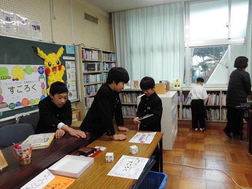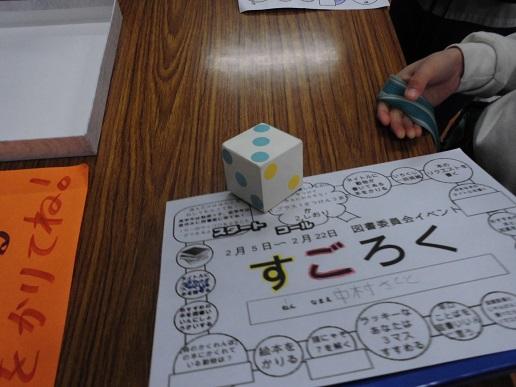 今日から図書委員会によるイベント「図書すごろく」がスタートしました。すごろくカードをもって図書室に行き、サイコロを振って、出た目の数だけ進みそこに書かれたことをするものです。すごろくカードには「タイトルにカタカナが入った本を借りる」「早口ことばを図書委員に言う」などのミッションが書かれています。勅使っ子タイムは高学年、昼休みは低学年がすごろくに挑戦できます。初日の今日は、みんな楽しみに図書室に足を運んでいました。