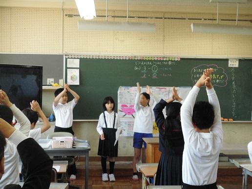 市連合運動会に出場する6年生を応援する壮行会が20日に予定されています。今週から5年生がリーダーとなって朝のぐんぐんタイムに応援の仕方を各クラスに教えに行っています。大きな声と手拍子で、6年生に力を与える応援ができるよう頑張っています。