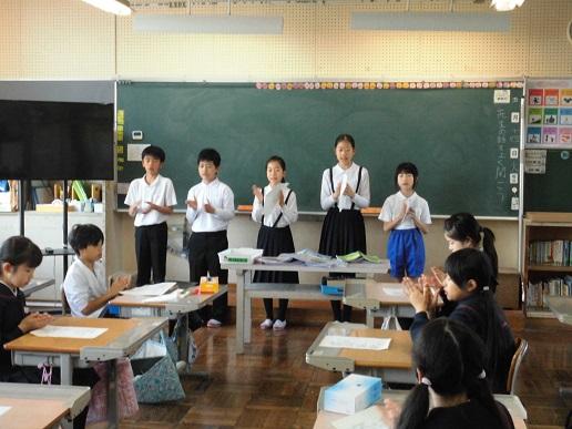 今日の5限目に先生方を招待して発表会をしました。音楽で学習した「うみ」という曲を、なりきりグループ(海の中のものになり切って表現)、波グループ(波の動きを表現)、砂グループ(砂に寄せる音を表現)の3つに分かれて、グループで表現方法を話し合い工夫しました。最後には3グループの合同発表を行いました。参観された先生方からも「工夫が良かった」「海らしさがでていた」とほめてもらい、子ども達も満足そうでした。