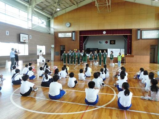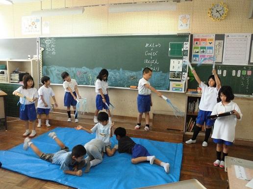 今日の5限目に先生方を招待して発表会をしました。音楽で学習した「うみ」という曲を、なりきりグループ(海の中のものになり切って表現)、波グループ(波の動きを表現)、砂グループ(砂に寄せる音を表現)の3つに分かれて、グループで表現方法を話し合い工夫しました。最後には3グループの合同発表を行いました。参観された先生方からも「工夫が良かった」「海らしさがでていた」とほめてもらい、子ども達も満足そうでした。