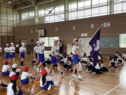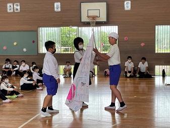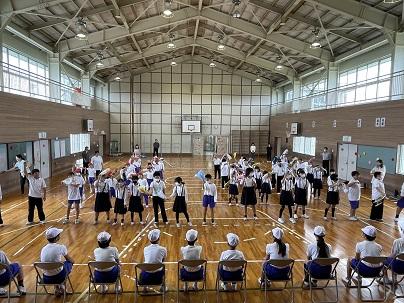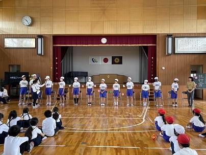 明日は加賀市の連合運動会が開催され、6年生が出場します。今日は5年生が企画・準備を進めてくれた壮行会を開き1~5年生からエールを送りました。壮行会では、各学級で撮影した応援動画を視聴したり、応援メッセージを書いた旗を手渡したり、応援歌を歌って踊ったりしました。みんなの熱い応援に、6年生もとてもうれしそうでした。