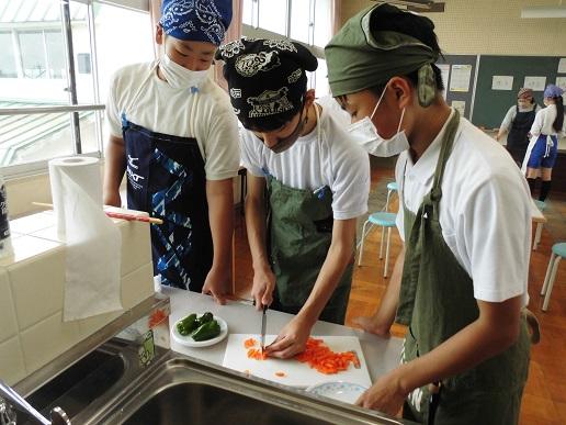 今日5,6限目に家庭科の学習で「いろどり野菜いため」の調理を行いました。玉ねぎ、にんじん、ピーマンを使った野菜ためです。野菜ごとに火の通りやすい切り方や炒める順番等を考えながら作りました。