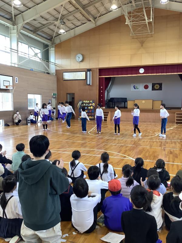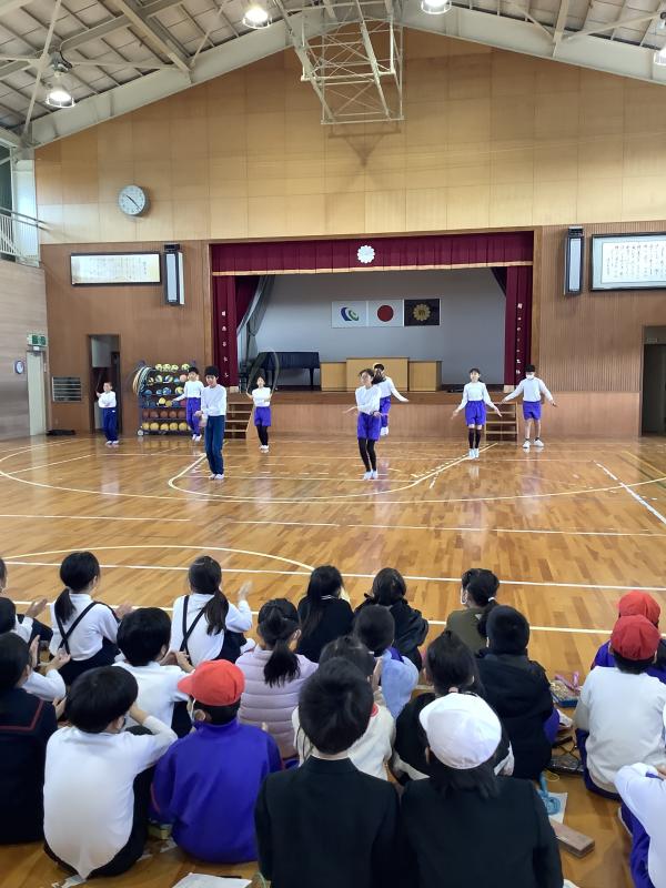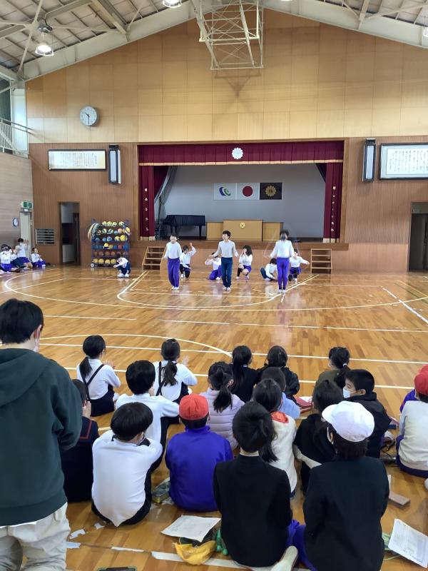 56年生のジャンピングロープショーがありました。体育の時間に56年生が工夫して跳び方を考えて、音楽にのせて縄跳びの発表をしました。56年生はいろいろな跳び方や難しい技などを取り入れて、なわとびの楽しさを表現しました。