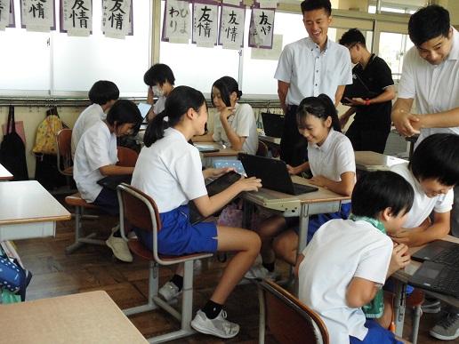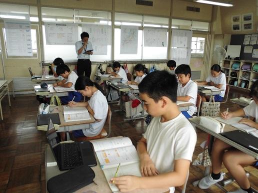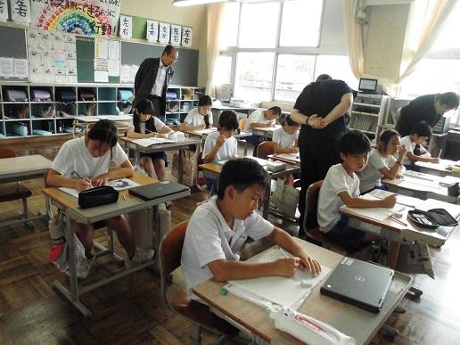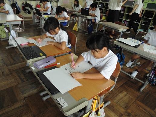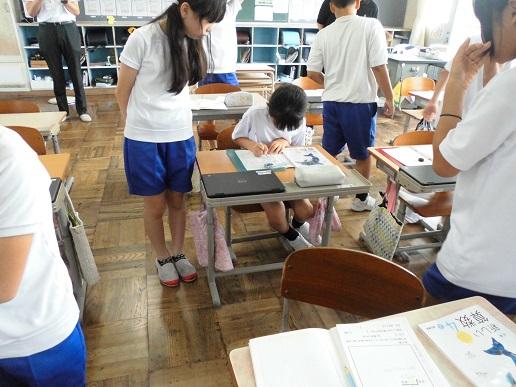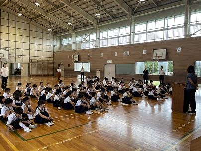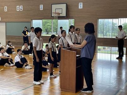 始業式では、まず7月末に行った加賀市水泳大会(通信大会)の表彰の後、校長先生からの話と夏休み作品展を鑑賞するときの注意についての話がありました。久しぶりに全校の元気な顔を見て、校歌の歌声を聞くことができてました。