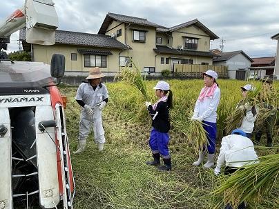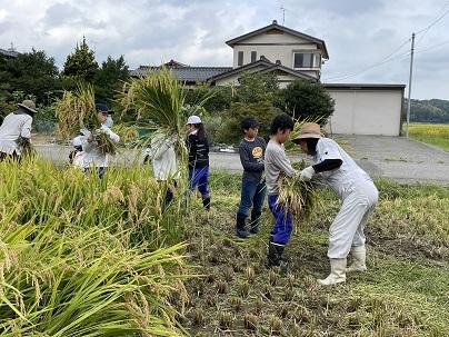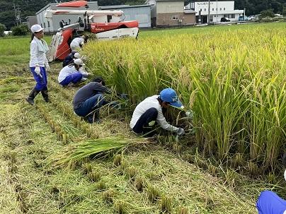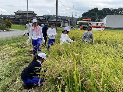 今日、2、3限目に5年生が稲刈りをしました。田植えでのときにも、御世話いただいた西川さんに稲刈りの仕方や注意点を教えてもらった後、作業を始めました。西川さんはザクザクと簡単に刈っていましたが、いざやってみると、なかなか簡単には刈ることができず苦労してました。でも、徐々に慣れて、汗だくになりながら頑張って作業に取り組んでいました。その後、コンバインでの稲刈りや脱穀の様子を見せていただき、機械による便利さを感じていました。