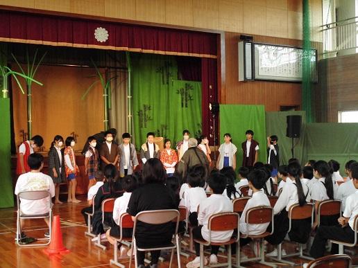 今日の午後、文化庁の学校巡回公演ミュージカル「良寛さん」の観劇を行いました。朝7時から劇団「鳥獣戯画」のスタッフが体育館で舞台や照明、音響の準備をスタート。いつもの体育館が良寛さんの舞台の竹林に変身。全校楽しみに始まりを待っていました。6年生も村の子ども役として出演し、9月に行ったワークショップの成果を発揮していました。劇、歌、踊り、人形操演といろいろな表現を子ども達は楽しんでいました。最後には全校で「てんてん手毬」の歌に合わせて踊って、盛り上がりました。