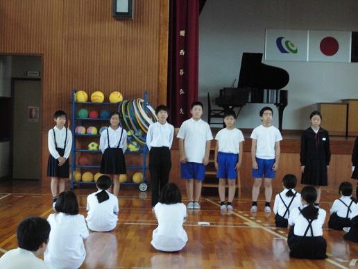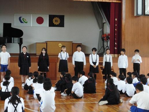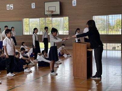 今日の全校集会で、後期児童会・学級役員の任命式を行いました。代表して後期児童会会長に任命証を校長から授与したあと、各役員から自分の抱負や各員会の目標などが発表されました。「みんなが笑顔になれる学校を自分でつくる・みんなでつくる」ことを目指し、それぞれがリーダーとして各委員会や学級、ファミリーをまとめていってほしいと思います。また、他の人たちもリーダーを支え、協力して、自分たちにとって最高のクラス、最高の学校をつくってほしいと思います。