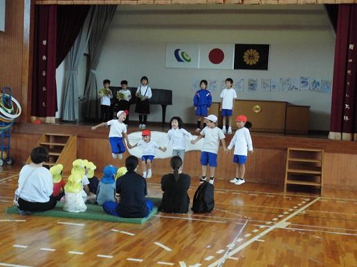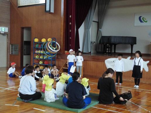 国語ので学習した「くじらぐも」を、保育園の子たちを招待して発表しました。音読だけでなく、セリフに合わせた動きや、クジラの上で踊る場面なども付け加えた楽しい発表でした。20分ほどの発表でしたが、保育園の子達も最後まで飽きることなく、楽しんでくれました。保育園の園長先生たちからも、小学校での成長をほめていただき、子ども達はとても満足そうでした。