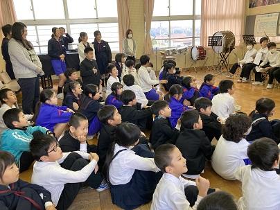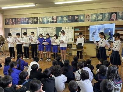 今日の長休みに1年生と6年生の音楽発表を行いました。もうすぐクリスマスということで、1年生はハンドベルで、6年生は3グループに分かれてアカペラでいろいろなクリスマスソングを発表しました。聴きに来たみんなも手拍子や応援のうちわで盛り上げていました。