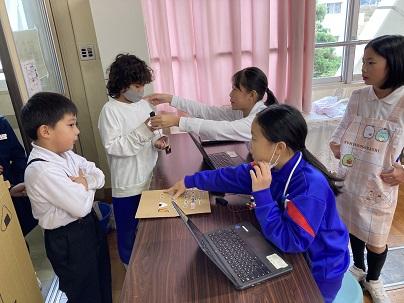 5年生はお米をテーマに田植えや稲刈りを体験したり、米作りについて調べたりしたことをスライドにまとめて発表したあと、おにぎりを提供するフードコートを開きました。注文して待っているお客さんにわたす、注文の品ができたことを知らせるブザーをプログラミングの学習を生かして作りました。