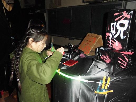 6年生はお化け屋敷とボーリングや輪投げ、さつまいものおやつを出す屋台を作りました。お化け屋敷の中には、人が通ると気味の悪い声が聞こえる仕掛けを作ったり、ボーリングや輪投げでは成功するとライトが光る仕掛けを作りました。