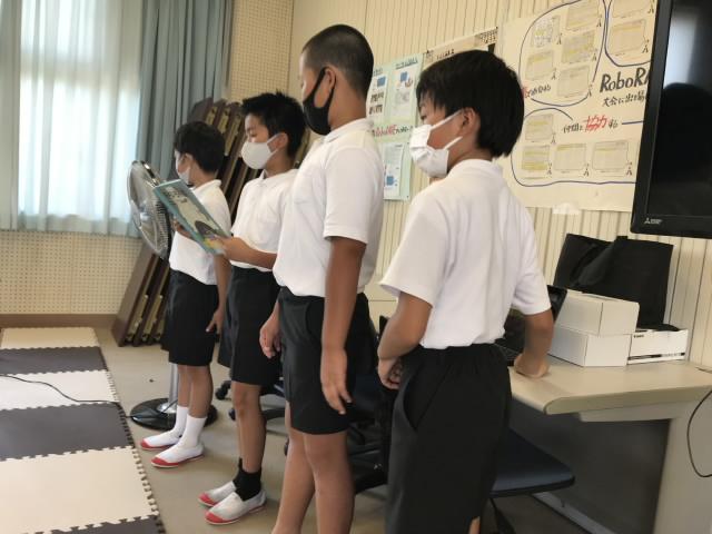 10月18日 4年生が国語で勉強したことを伝えにやって来ました。戦争に関する本を読み、じぃーんときたところを紹介してくれました。