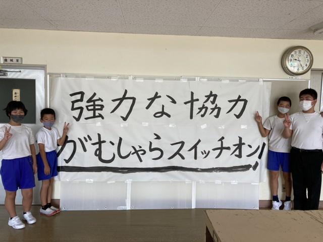 9月6日 運動会会に向けて、練習が始まりました。今年のテーマは「強力な協力」スローガンは「がむしゃらスイッチオン!」です。児童玄関前に掲示しました。