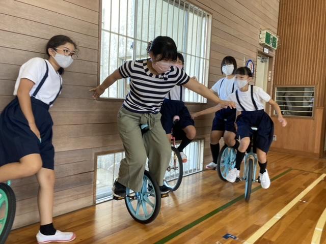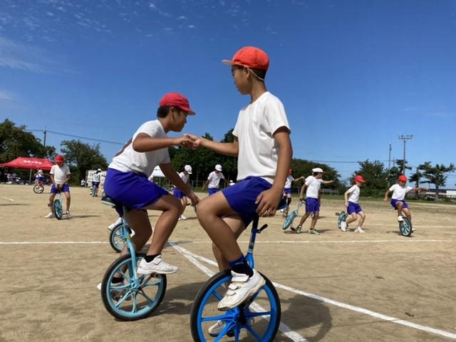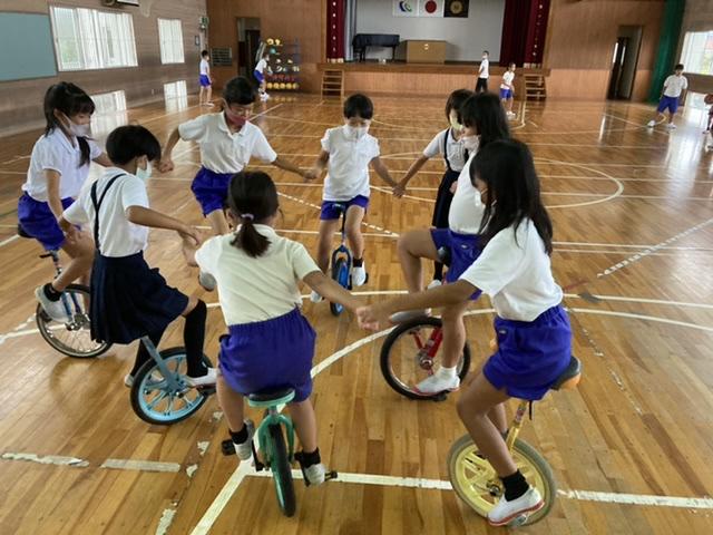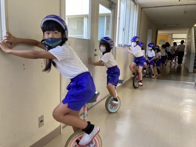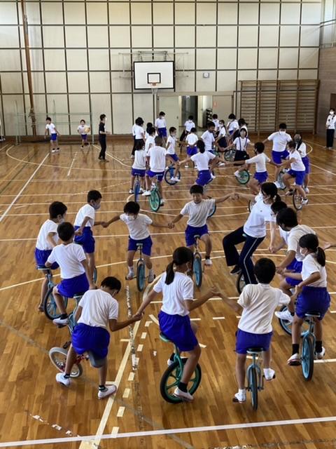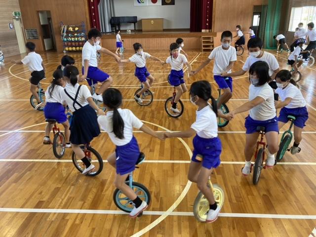 9月30日 長休み時間に行っている全校みんなでの一輪車、先生も一緒に楽しんでいます。