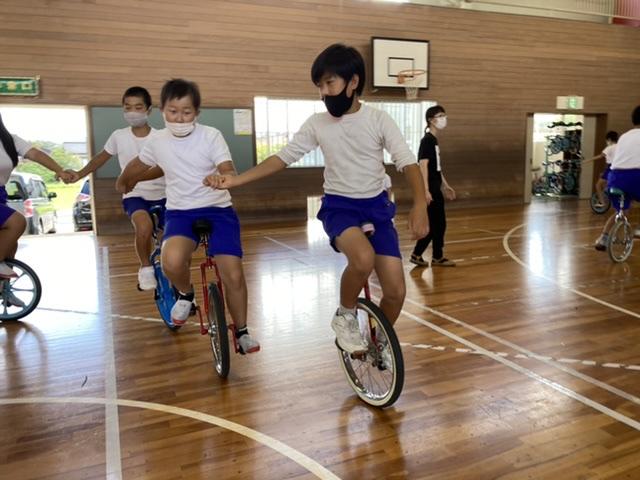 9月10日 高学年の一輪車演技の練習の様子です。休み時間返上で、自主的に、全員が練習をしていました。