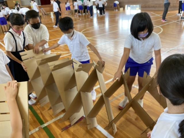 9月28日 万が一に備えて、防災教室が行われました。地域の防災士さんから、防災基地や防災グッズについてのお話を聞いたり、段ボールベットの組み立て体験をしたりしました。