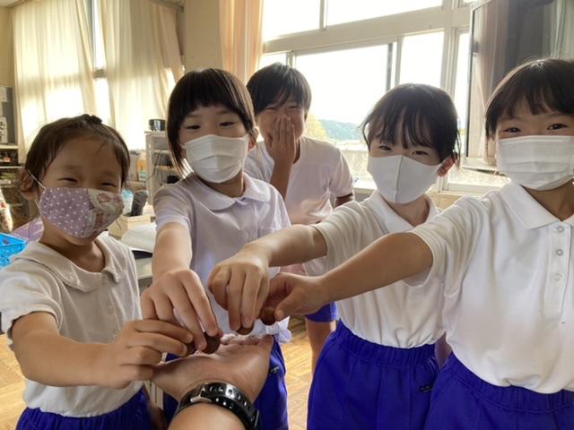 10月7日 1年生がキレイな落ち葉やどんぐりを拾いに行ってきました。戻ってきた1年生がプレゼントを届けてくれました。小さなどんぐりの中に温かい心が詰まっていました。