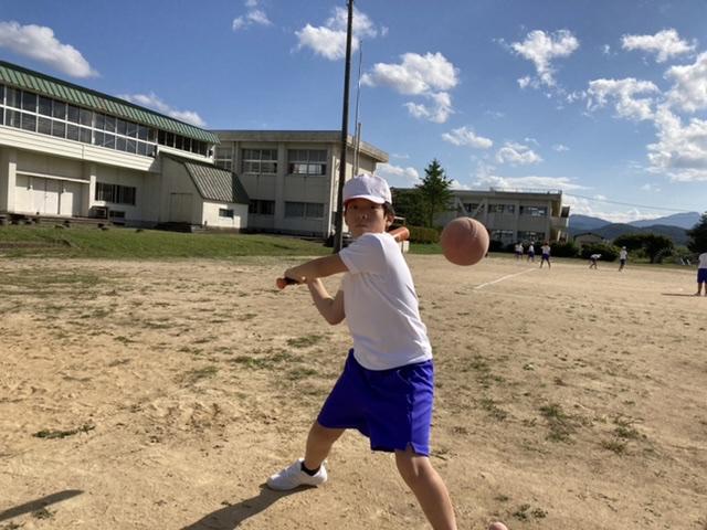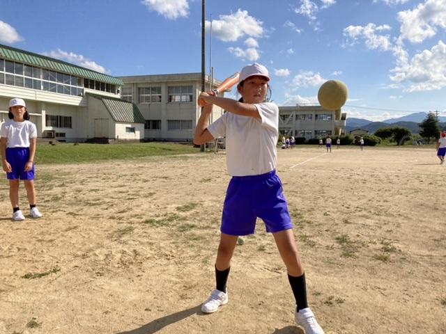 高学年や中学年が体育で野球を楽しんでいます。ホームランを狙って練習やゲームを楽しんでいました。