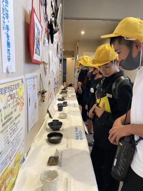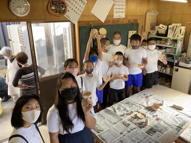 10月11日 6年生が地区の陶芸サークルの先生に教えていただきながら、お皿やお茶碗を作り、素焼きした作品が出来上がりました。