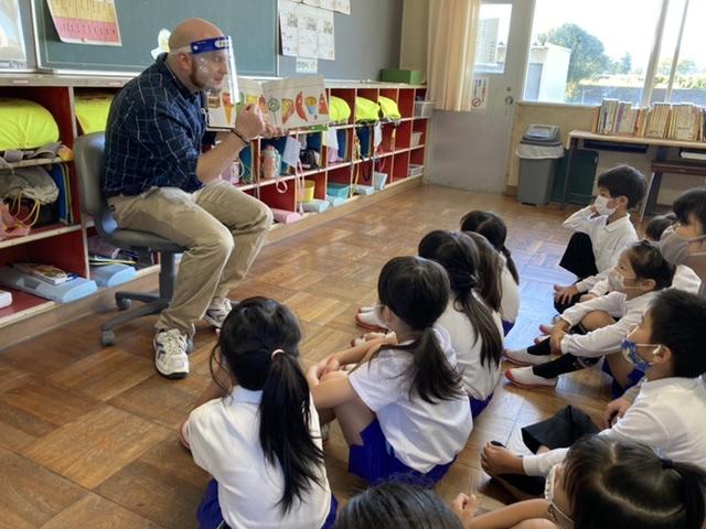 10月14日 ALTの先生が朝から1年生に読み聞かせをしてくださいました。とても楽しそうでした。