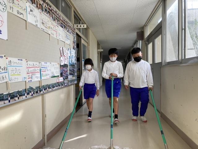 11月8日 1列に並び、モップ持った子どもたちがやって来ました。