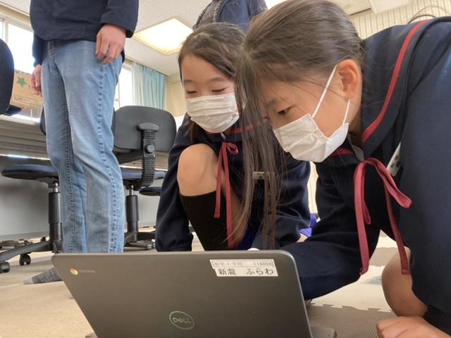 12月9日 ローカを歩いていると視聴覚室から、楽しい音が聞こえてきました。中では、プログラミングをがんばっていました。