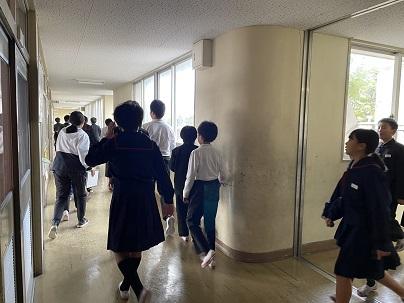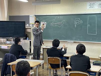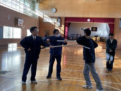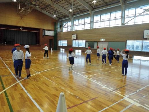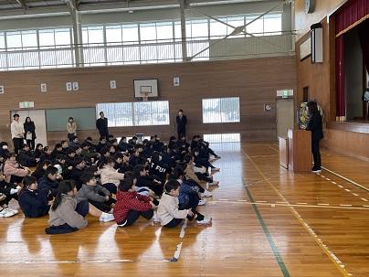 5限目に体育館非常口より不審者が侵入したという想定で訓練を行いました。不審者侵入の第1報の後、先生の指示に従い集まって次の指示を待ち、避難の放送で素早く体育館に集まることができました。その後、大聖寺警察署の方から「いかのおすし」の話や実際に後ろから襲われた時の対応を練習しました。放課後には、教職員対象にさすまたの使い方や不審者への対応のポイントを教えていただきました。