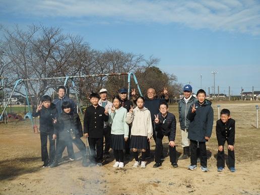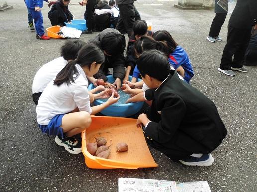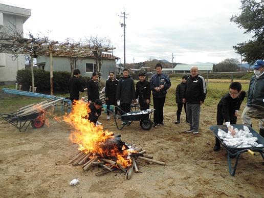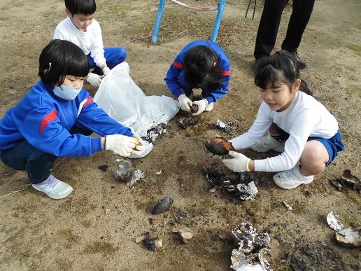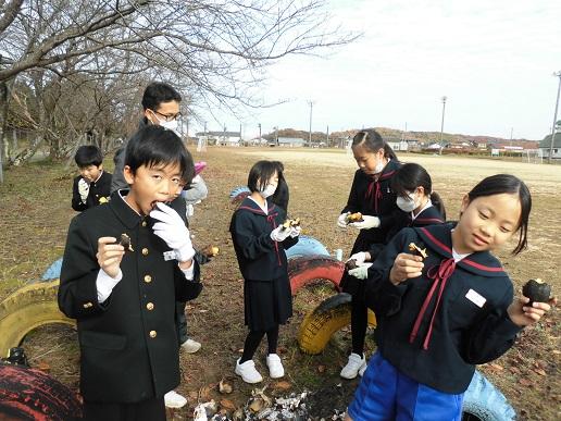 ファミリー(全校縦割りグループ)で植えて、お世話し、10月初めに収穫したサツマイモ。天候が悪くなかなか実施できなかった焼いもパーティーを、今日ようやく実施することができました。朝早くから4名の地域の皆様のご協力のもと焚火の準備をすすめました。子ども達は朝休みの間に、ファミリーごとにさつまいもを洗って新聞紙に包み、さらにアルミホイルをまきました。6年生が代表して、それを火の中に入れて約1時間、長休みには熱々の焼いもが完成しました。中までトロトロに柔らかく、とても甘い焼いもに全校大喜びでした。みんな大満足の焼いもパーティーとなりました。ご協力いただいた地域の皆様、ありがとうございました。