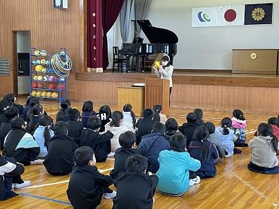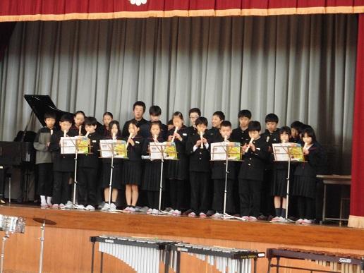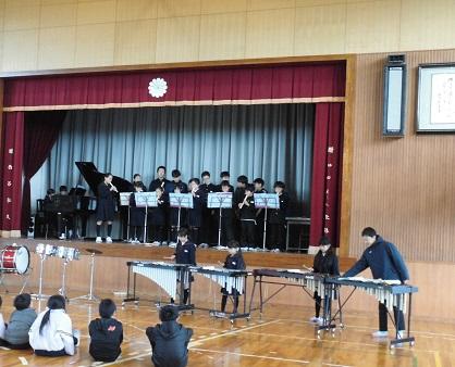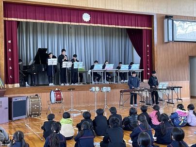 コロナ禍の影響で6年生は、一度も加賀市の音楽会に出演することができませんでした。そこで、日頃の音楽の学習の成果を発表する場として、校内での音楽会を開催しました。3年~6年の各学年の合奏発表のあと、低学年の打楽器のリズムにのって全校で「あわてんぼうのサンタクロース」を合唱しました。全校で音楽を楽しむひとときとなりました。