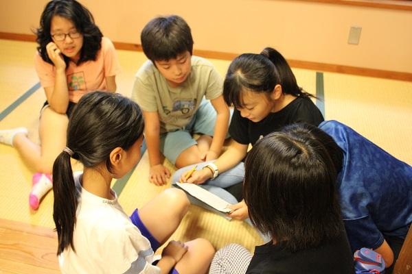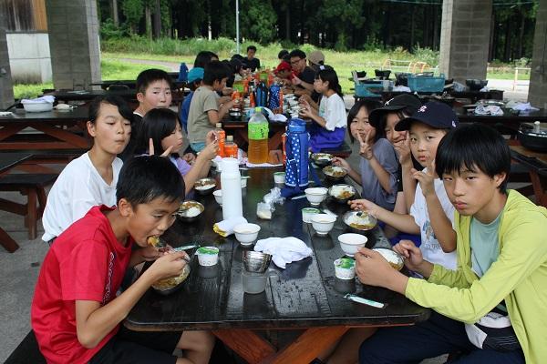 大杉みどりの里で1泊2日の合宿を行いました。前日からときおり激しい雨がふり、当日もあいにくの天気となってしまいました。そのため、川遊びは当初予定していた場所や時間を変更したものの、それ以外の活動は予定通り行うことができました。小雨が降っていても、子ども達が外に出ると雨も上がり、ウォークラリーや肝試しを行うことができました。職員の方からは、イワナをさばいたり、木工作でのこぎりを使ったり、野外炊飯での調理や後始末をしたりする子ども達の手際の良さを大変ほめていただきました。自然に触れ合う中で、仲間と協力して過ごすことができた2日間