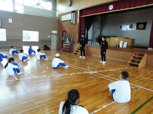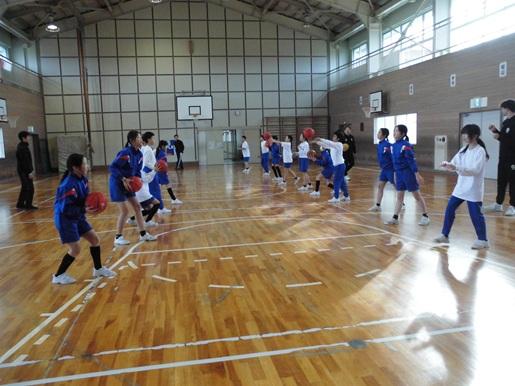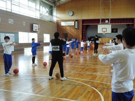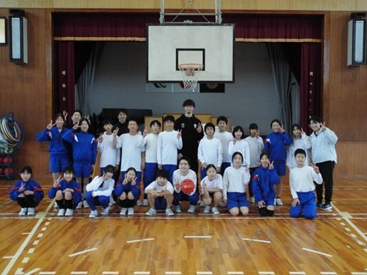 金沢市をホームタウンとするプロバスケットチームの金沢武士団のコーチ2人が来校し、5,6年生対象にスポーツ教室を開催しました。基本姿勢からはじまり、パスやドリブル、シュートのポイントを分かりやすく説明していただきながら練習しました。最後にはコーチ2人が児童4チームと順番に試合をしてくれました。遠いところから見事にシュートを決めるプロの技に、子ども達からは歓声が上がっていました。
