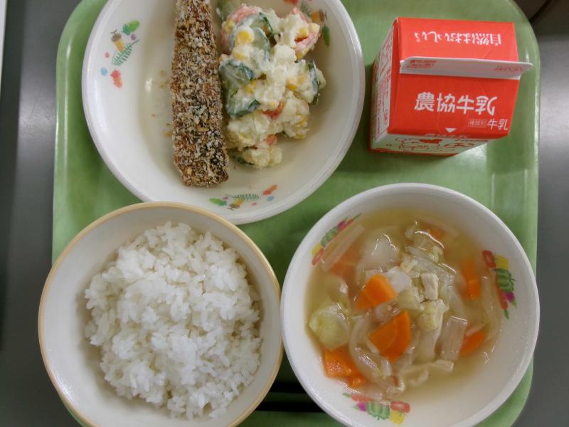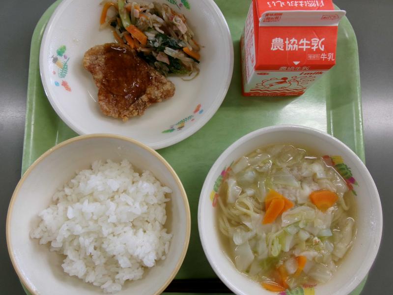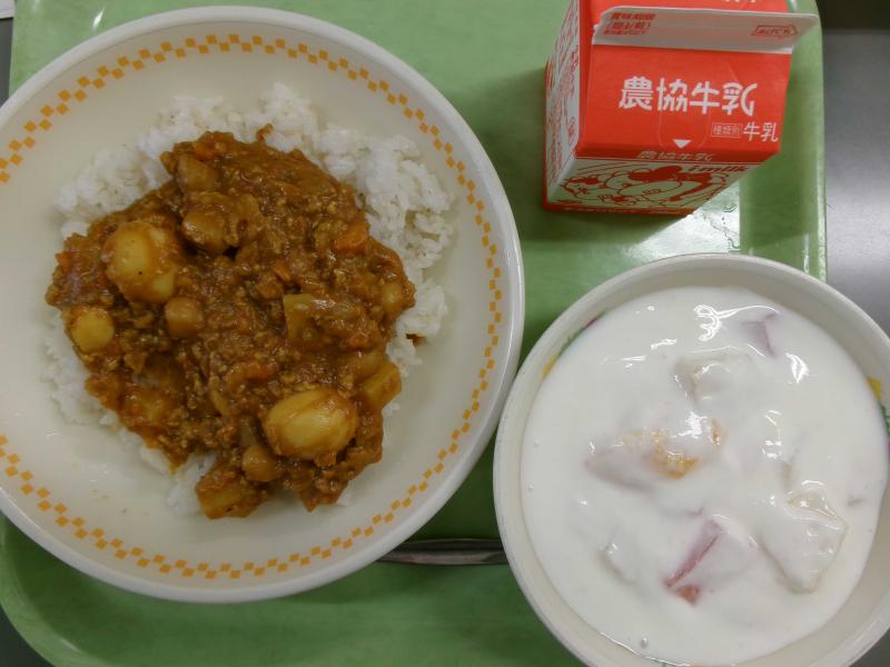 <松任トマトとうずら卵のドライカレー、フルーツヨーグルト>白山めぐみん給食(トマト)