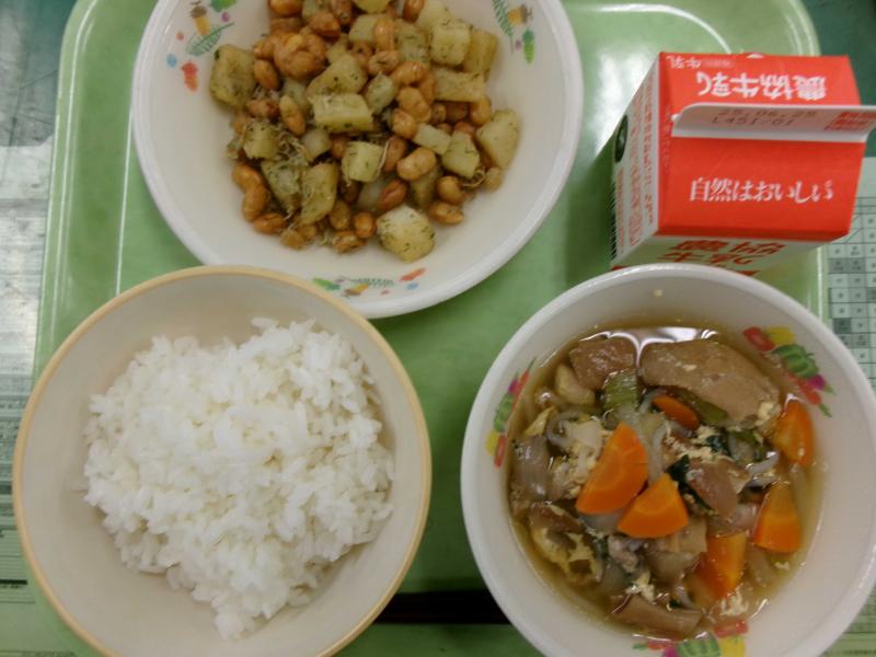 <大豆とじゃがいもののり塩、車ふの卵とじ>