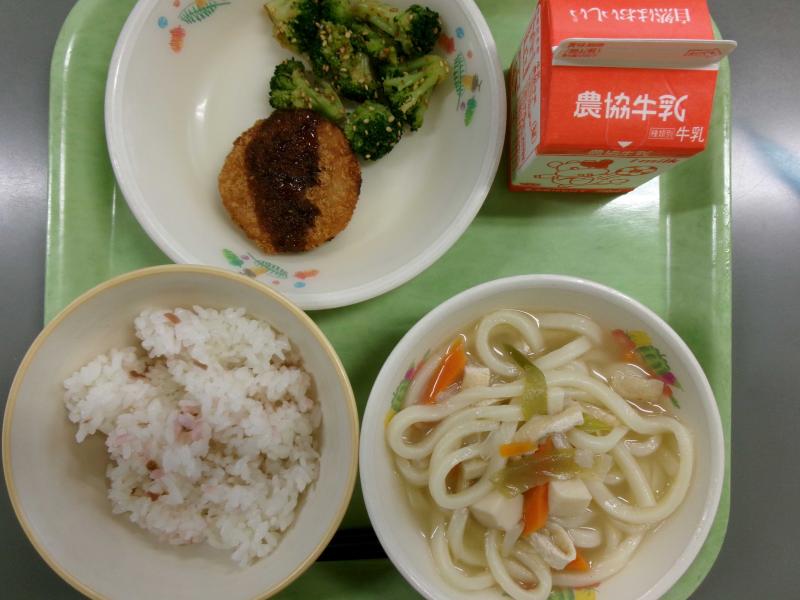 <コロッケ、ブロッコリーのおかか和え、にぎやかうどん>おはなし給食「うどんのうーやん」