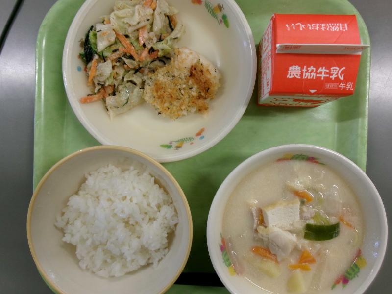 <鶏の香草パン粉焼き、野菜のごまドレ和え、豆乳みそ汁>