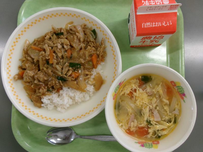 <みそだれ焼肉丼、桃太郎トマトとたまごの中華スープ>