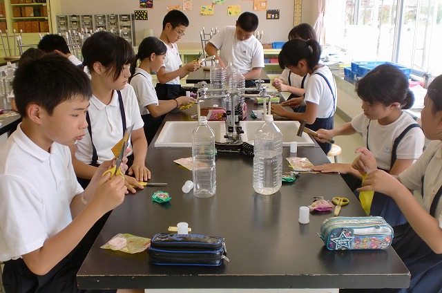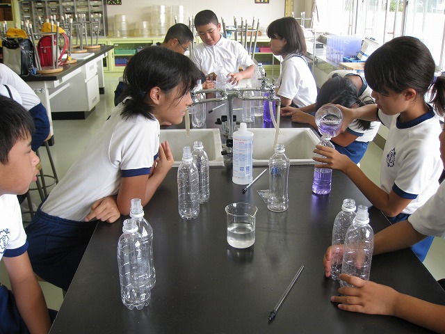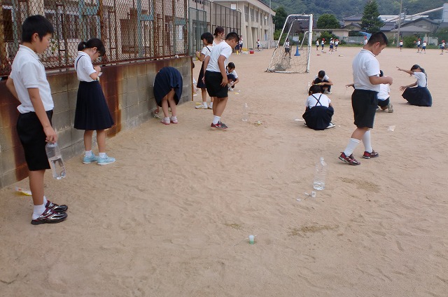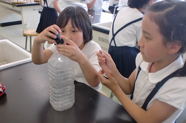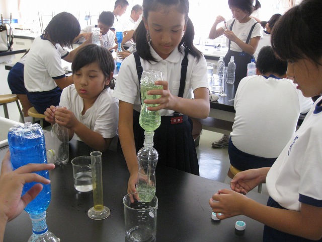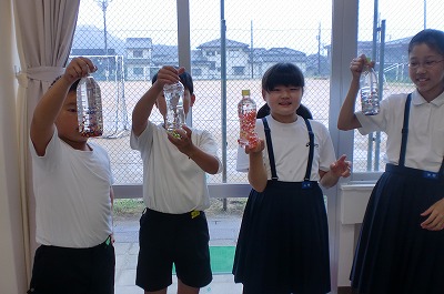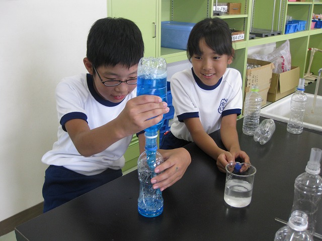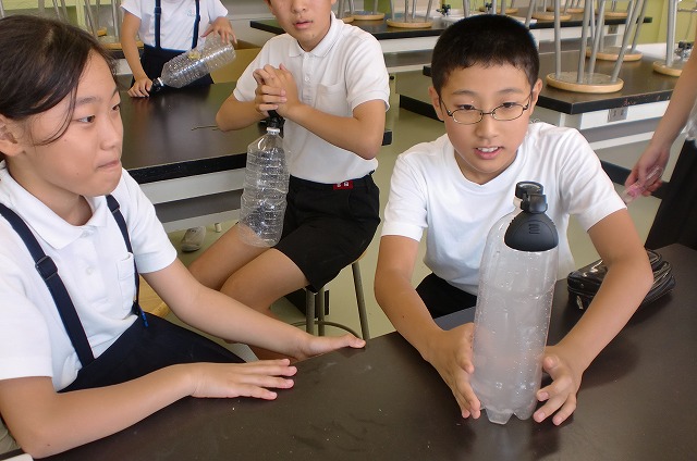 第3回 科学クラブがありました。 「ペットボトルで雲を作ろう」という実験をしました。 フィズキーパーを使うとペットボトルの中の空気圧を簡単に高めることができます。 中に線香の煙を入れて、核になるものを入れてやると・・・ 雲らしくなります!! ペットボトルがはれつしそうになるくらいがんばってプッシュしている子がたくさん いました・・・!とても楽しそうでした。 最後にはふりかえりもしました。 身近な材料で手軽に雲ができるので、家でもやってみたいという感想が多かったです。 ・・・・次回は、フイルムケースロケットを飛ばそうです。